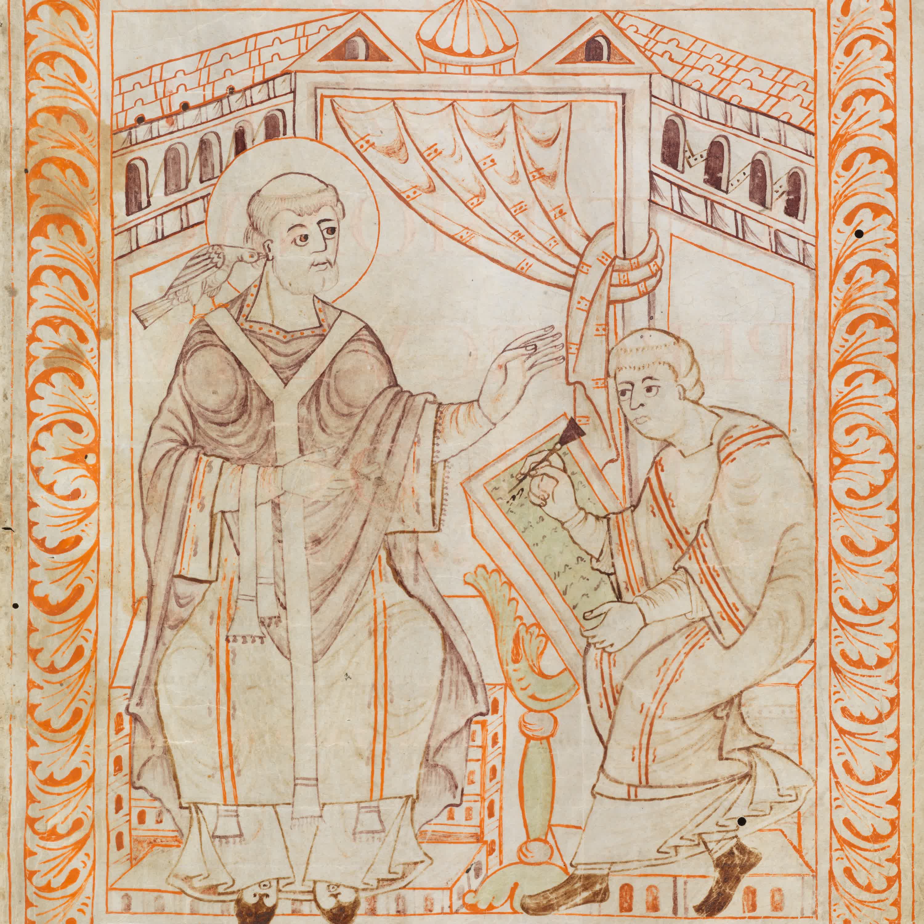 Pope Gregory I dictating Gregorian chants, from the Antiphonary of Hartker of Sankt Gallen