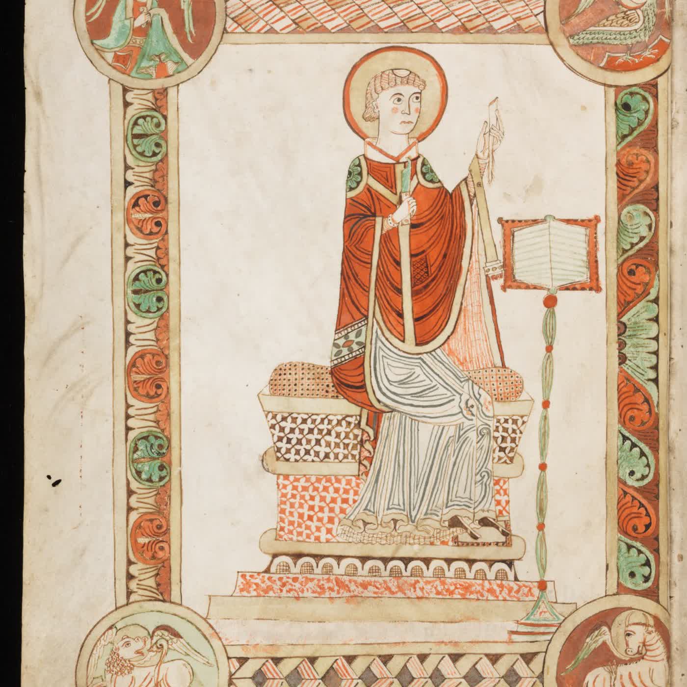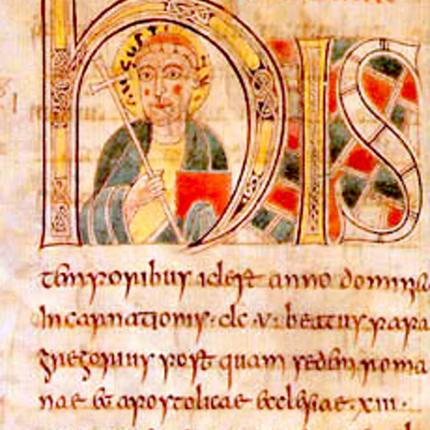 The opening three letters of Book 2 of Bede are decorated, to a height of 8 lines of the text, and the opening h contains a bust portrait of a haloed figure carrying a cross and a book. This is probably intended to be St. Gregory the Great, although a much later hand has identified the figure as St. Augustine of Canterbury.